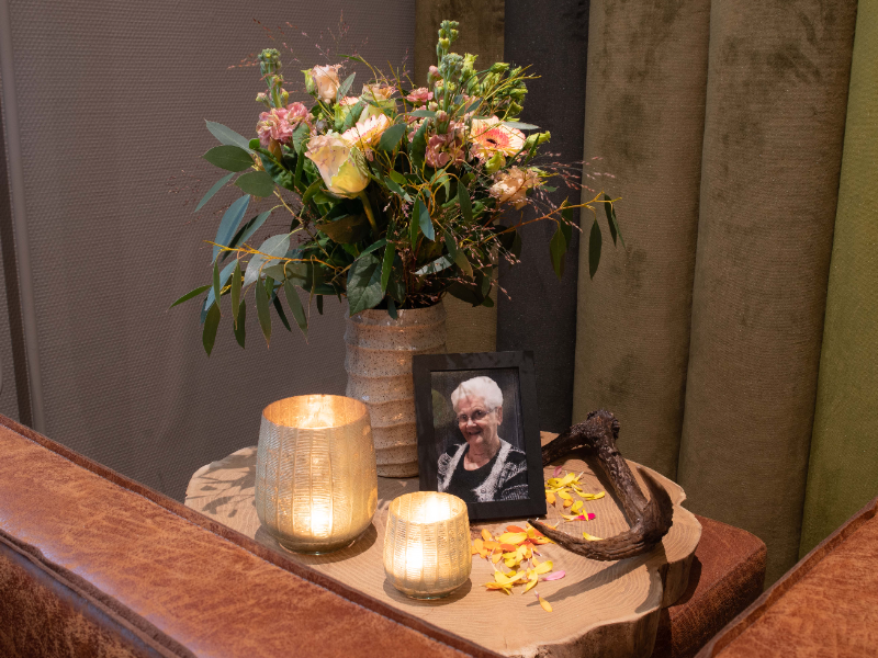 Herdenkingsboeket bij foto of urn